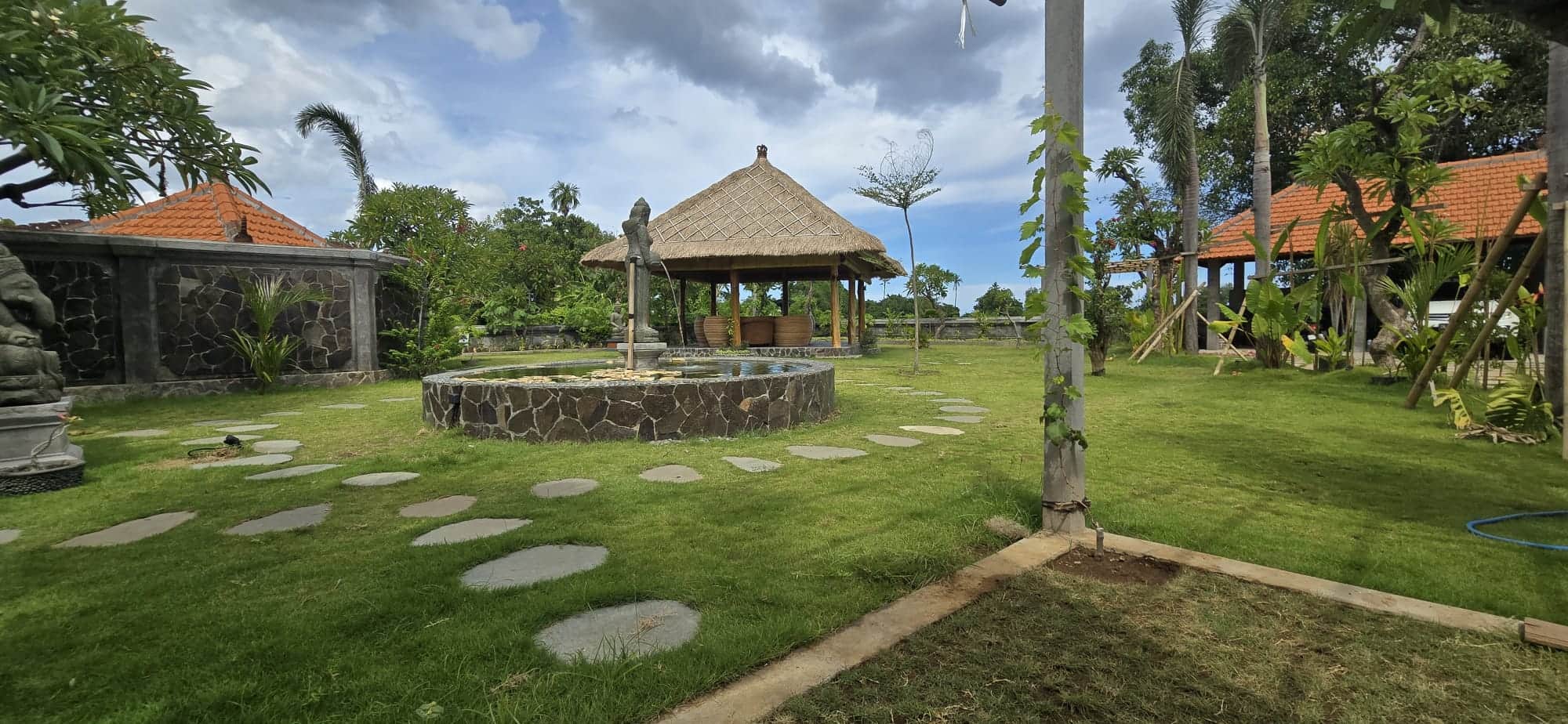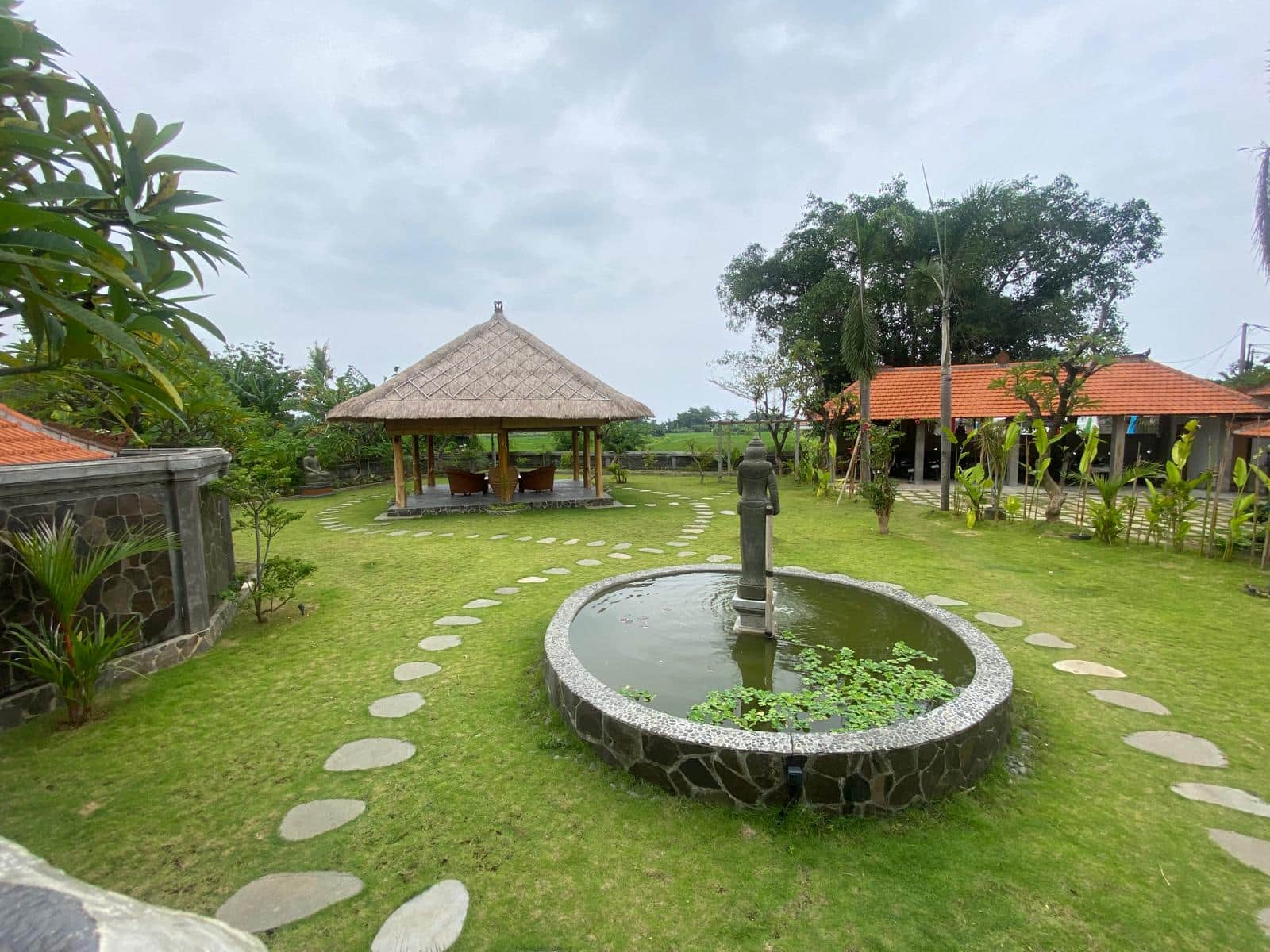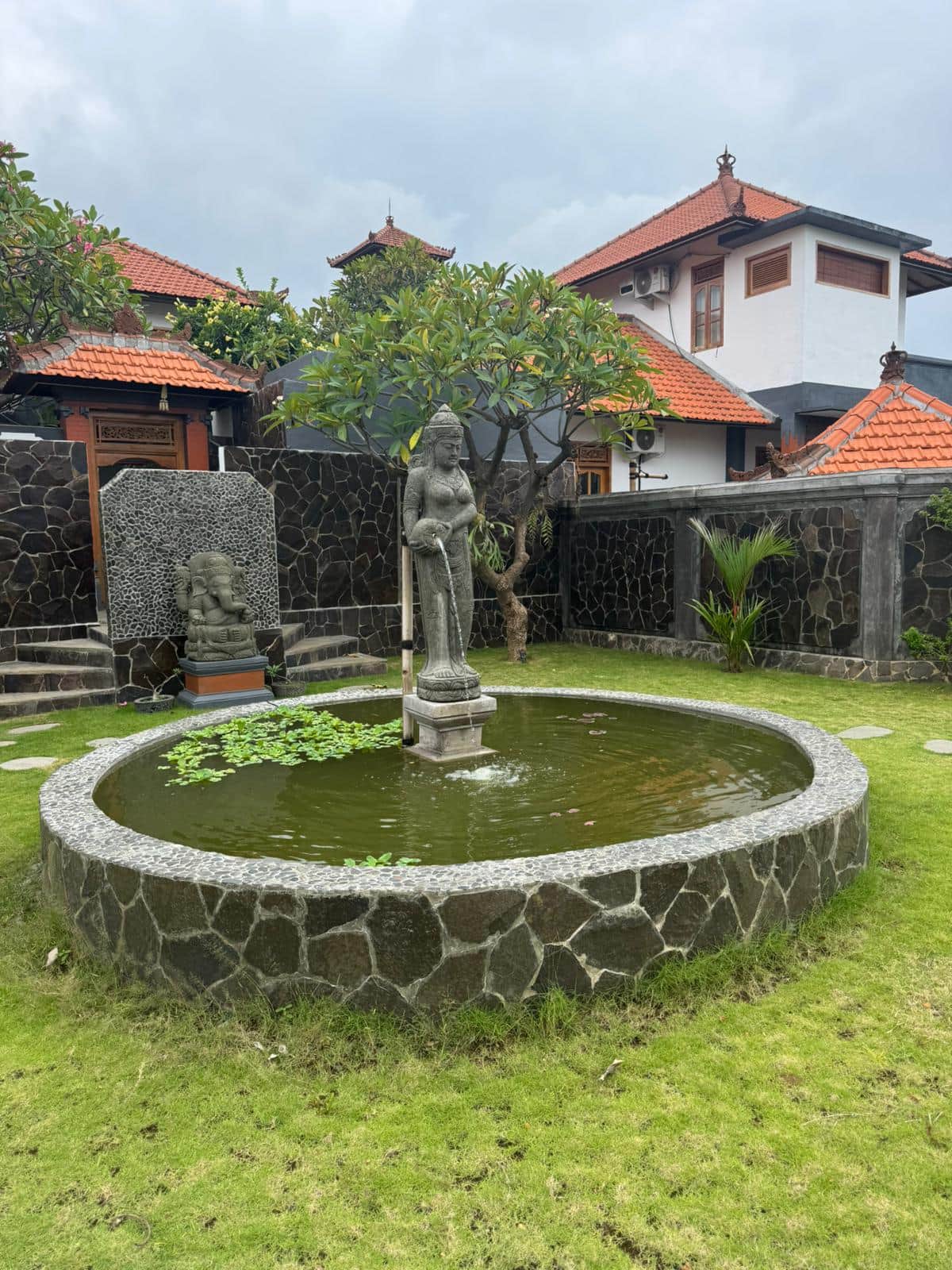 The Shala Garden is a private area located within the property, featuring a large water fountain and several ceremonial statues that creates a peaceful setting.